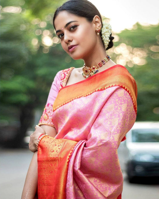 Pure Silk Kanjivaram Pink and Cream Saree With Unstitched Blouse