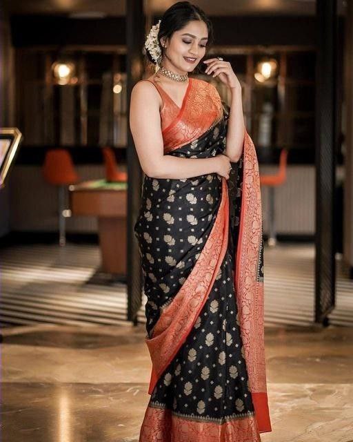 Black Kanjivaram silk Saree With Red Soft Blouse