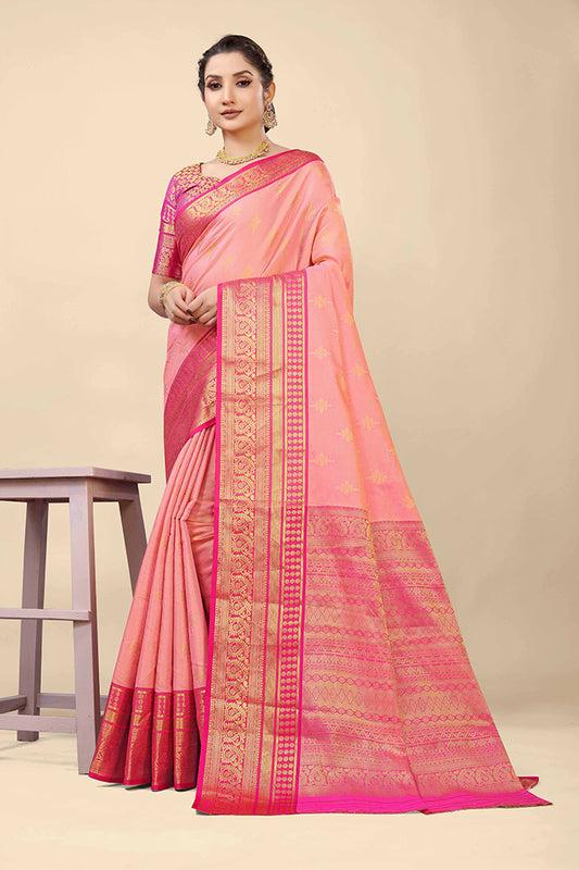 Elegant Peach-Pink Banarasi Silk Saree with Golden Zari and Magenta Border