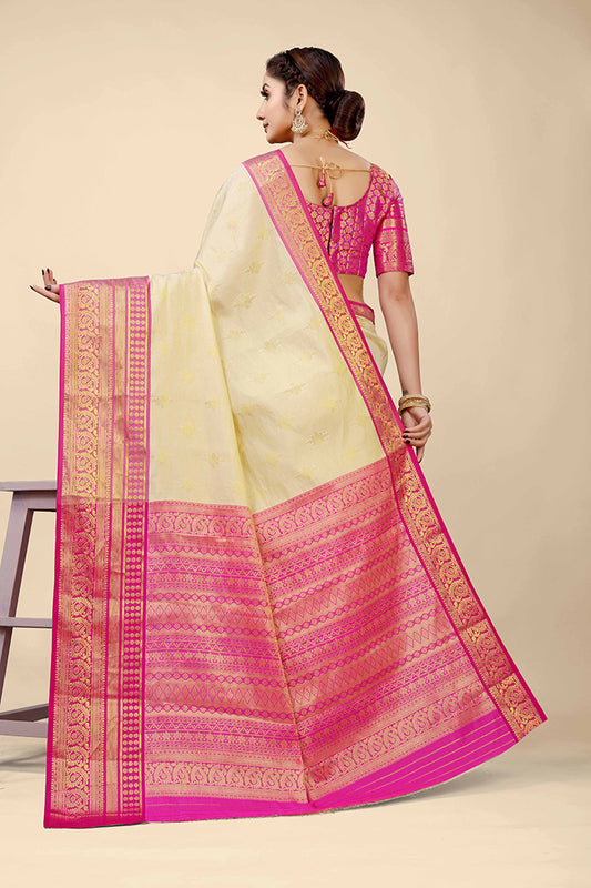 Elegant Cream and Pink Zari Work Saree with Gold Embroidery