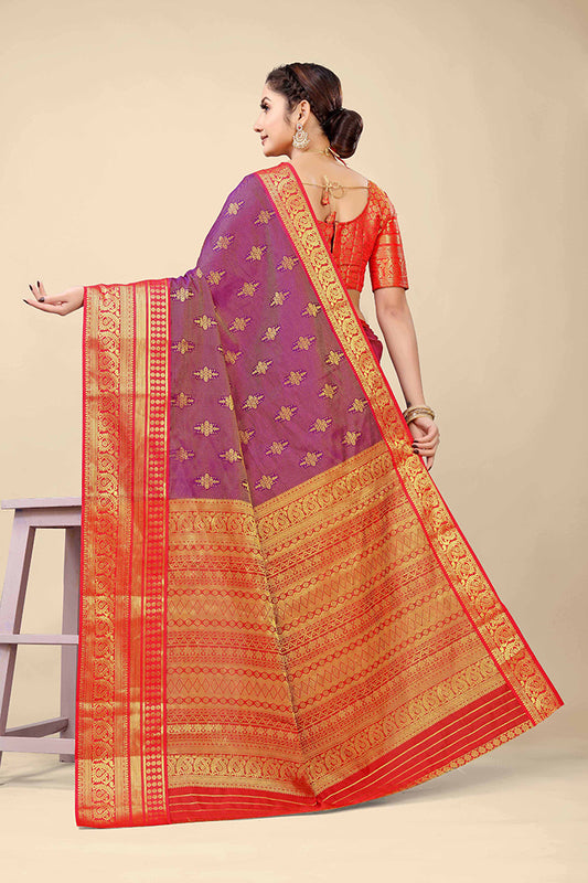 Elegant Purple & Red Banarasi Silk Saree with Rich Zari Work