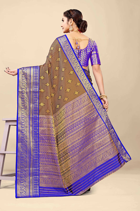 Taupe Brown & Royal Blue Banarasi Silk Saree with Gold Zari Work