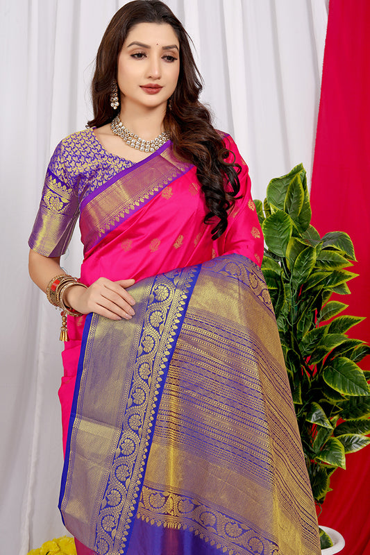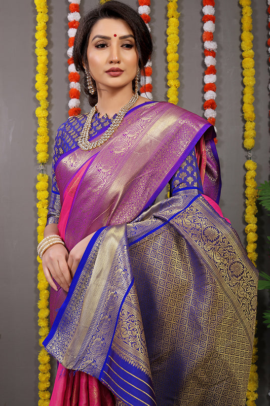 Pink Silk Saree with Royal Blue and Gold Zari Woven Pallu