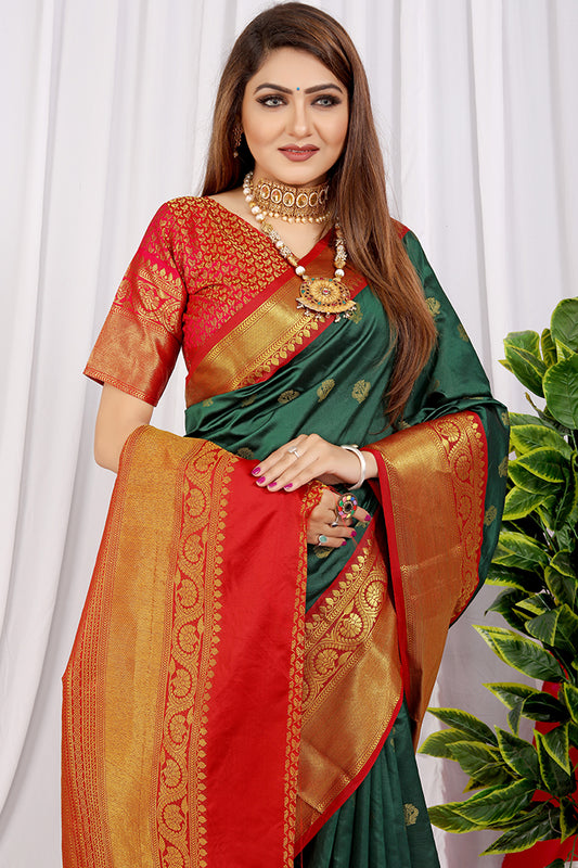Emerald Green Silk Saree with Red & Gold Zari Woven Border