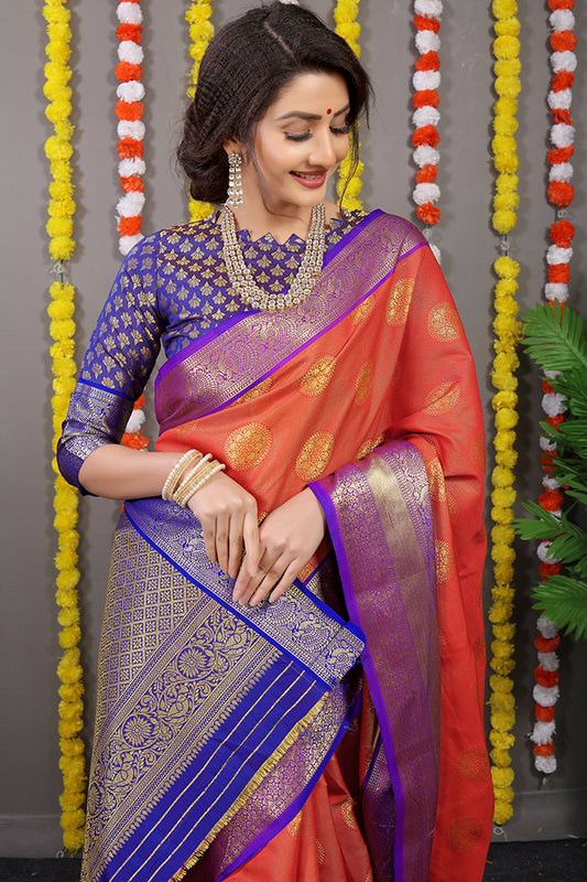Orange and Royal Blue Banarasi Silk Saree with Zari Woven Border