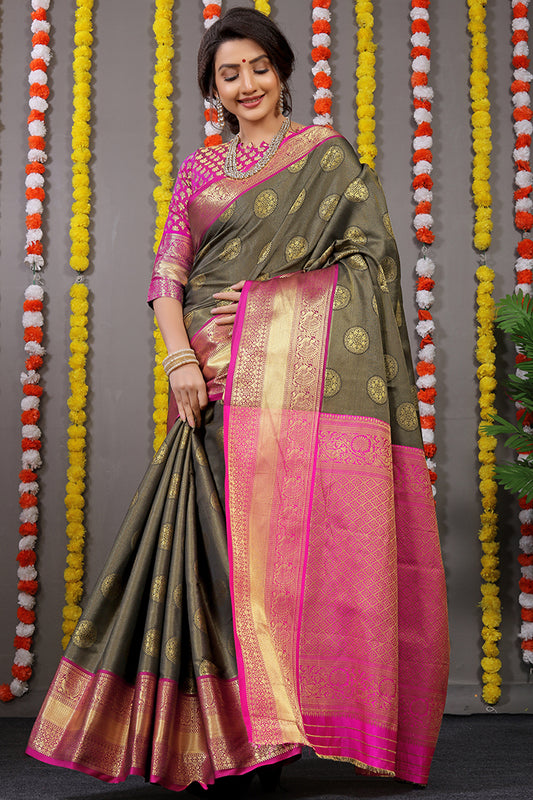 Charcoal Grey & Pink Banarasi Silk Saree with Gold Zari Weaving