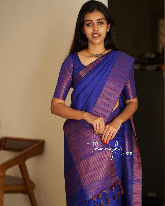 Pure Silk blue Kanjivarm saree with copper zari border for women